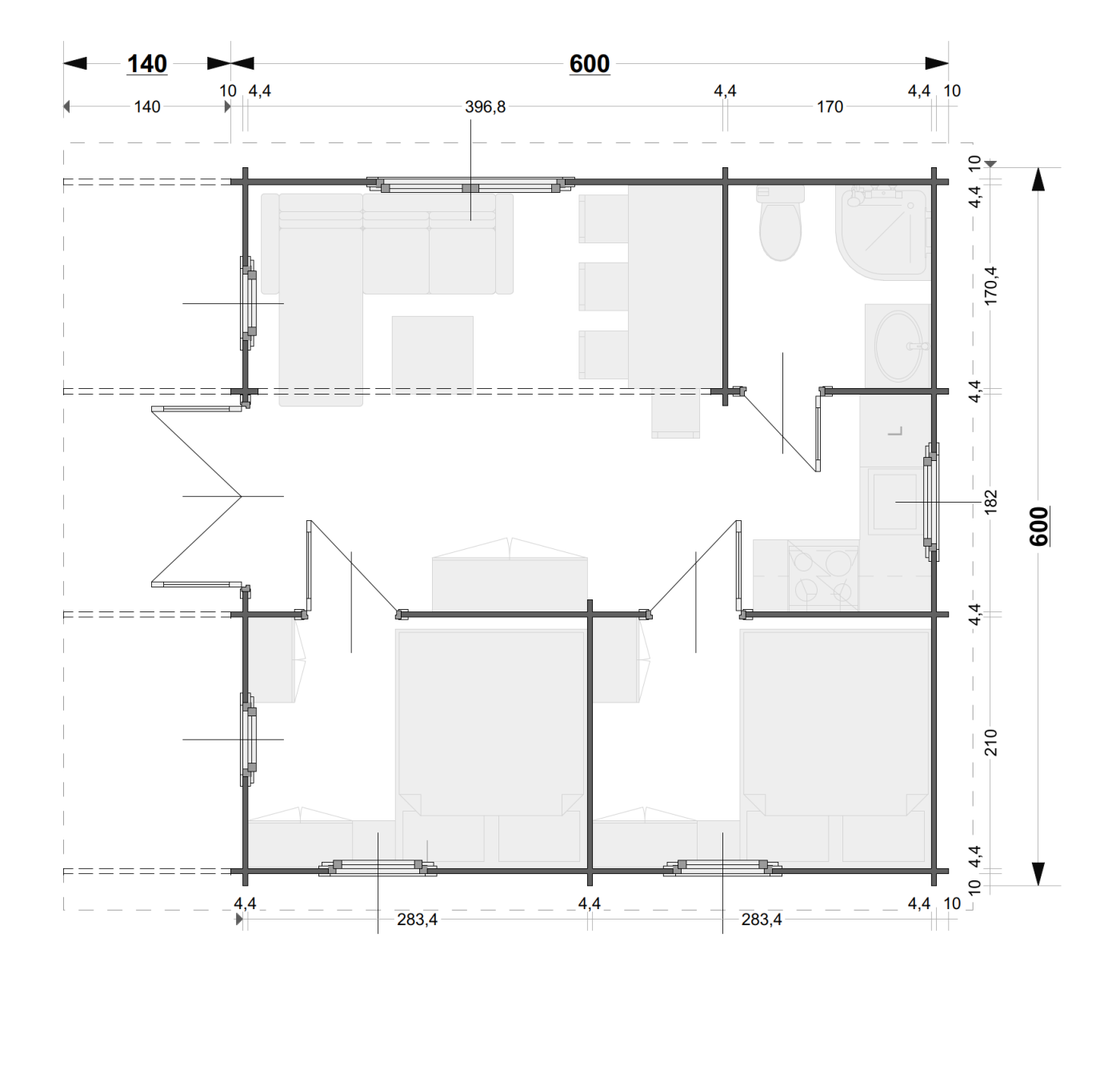 - Ilość podwójnych okien uchylnych rozwieranych: 1 x 1560 x 1050 mm oraz 3 x 800 x 1050 mm — dadzą więcej przestrzeni i komfortu w domek.