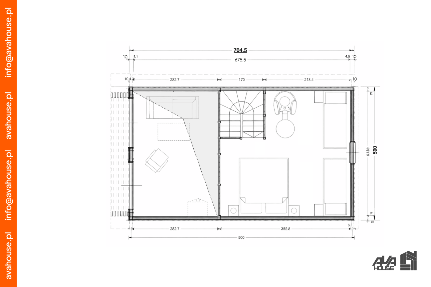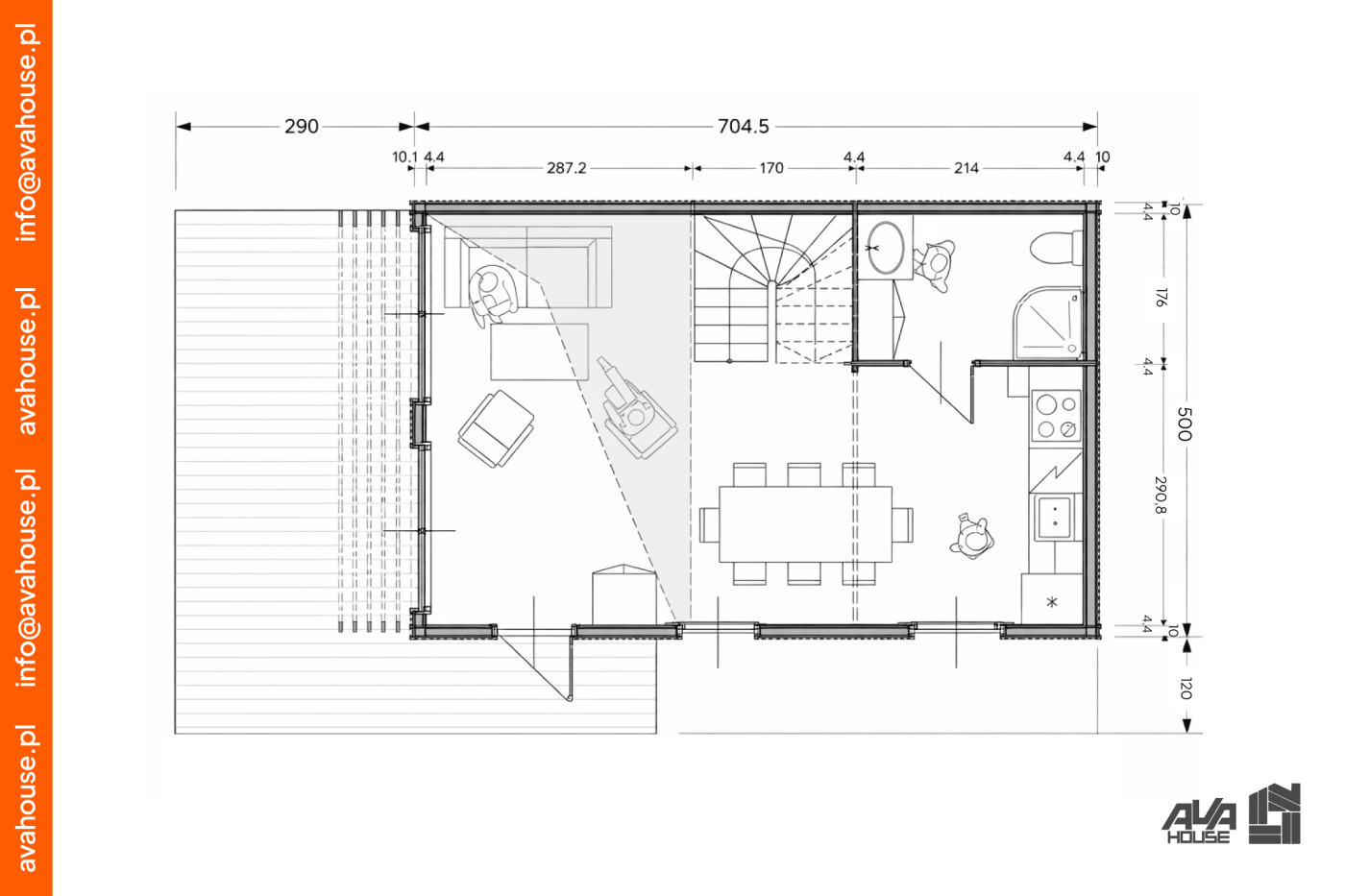 Domek wykonany jest z litego bala świerkowego, co zapewnia trwałość i naturalny mikroklimat we wnętrzu. Po zastosowaniu zewnętrznego ocieplenia deską HARMONY VERTICAL bryła zyskuje nowoczesny, minimalistyczny wygląd, doskonale wpisujący się w aktualne trendy architektoniczne.Dwuspadowy dach o kącie nachylenia 30° podkreśla styl „nowoczesnej stodoły”, a jego konstrukcja gwarantuje solidność i estetykę na lata.